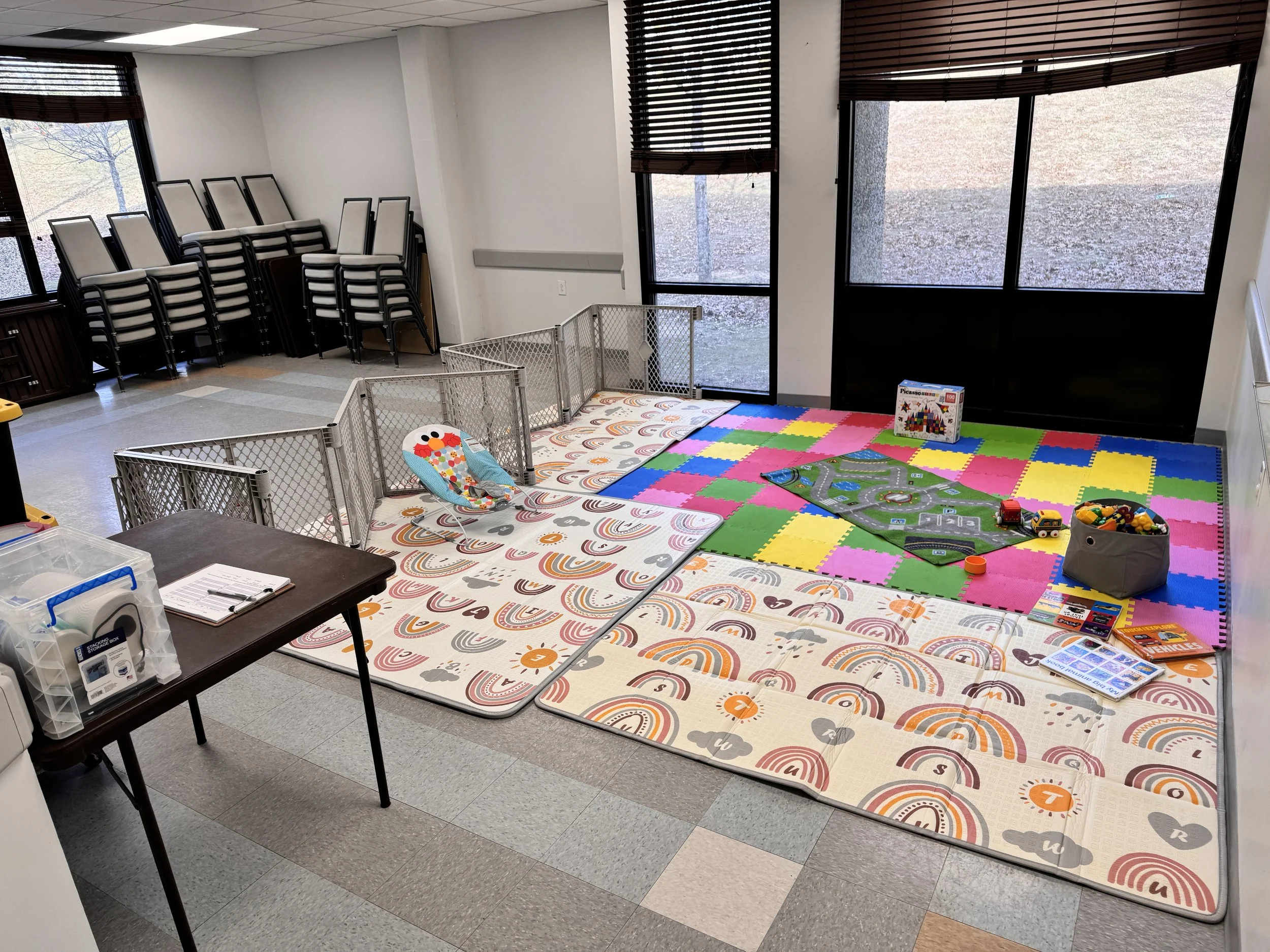Layout the 3 mats from the gray bags AND the small rug found in one of the nursery bins